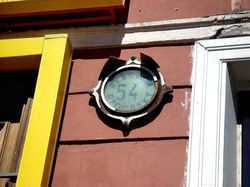 ![]() Рекламный «номерной знак». Фото 2000-х годов. | ![]() Номерной знак. Фото 2007 годов. | ![]() Фонарь на фасаде дома № 1 по Адмиралтейскому каналу. Фото 2010-х годов. |