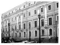 ![]() Шуваловский дворец. Итальянская улица, дом № 25/1. Фото 1970-х годов. | ![]() Здание Министерства юстиции Российской империи. Итальянская улица, дом № 25/1. Фото 1890-х годов. | ![]() Корпус дома Министерства юстиции. Малая Садовая улица, дом № 1/25. Фото 1880-х годов. |