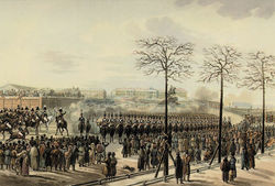 ![]() Санкт-Петербургский военный генерал-губернатор граф Михаил Андреевич Милорадович (1770-1825). | ![]() Мятеж на Сенатской площади в Санкт-Петербурге 14 декабря 1825 года. Акварель К.Кольмана. 1830-е годы. | ![]() Выстрел П.Г.Каховского в графа Михаила Андреевича Милорадовича 14 декабря 1825 года. Гравюра 1862 года. |